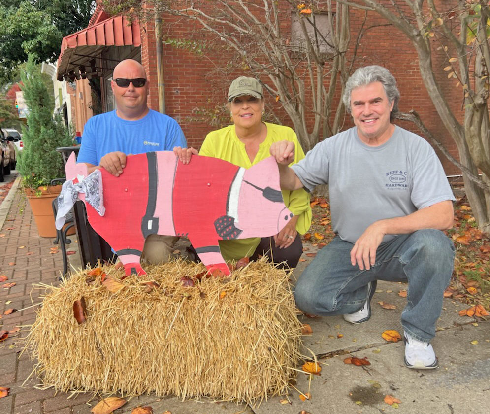 Checking on the town’s pig decor for Ridgeway’s annual Pig on the Ridge festival this weekend (Friday night and Saturday),are Pig on the Ridge steering committee member Tony Jones, and downtown merchants Shelly Williams (The Jewelry Lady) an Dan Ruff (Ruff’s Hardware). | Barbara Ball