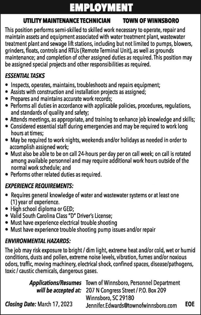 Employment: Utility Maintenance Tech