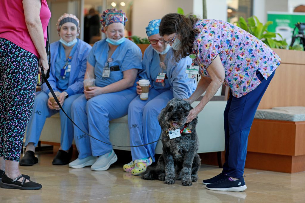Community members were invited to the North Tower Atrium inside Lexington Medical Center from 2 – 4 p.m. on Tuesday, Feb. 14, 2023, to shake off some stress by petting a hospital therapy dog. Lexington Medical Center clinicians were on hand to answer questions about how managing stress and finding relaxing activities can help their health. Visitors received a free blood pressure screening.