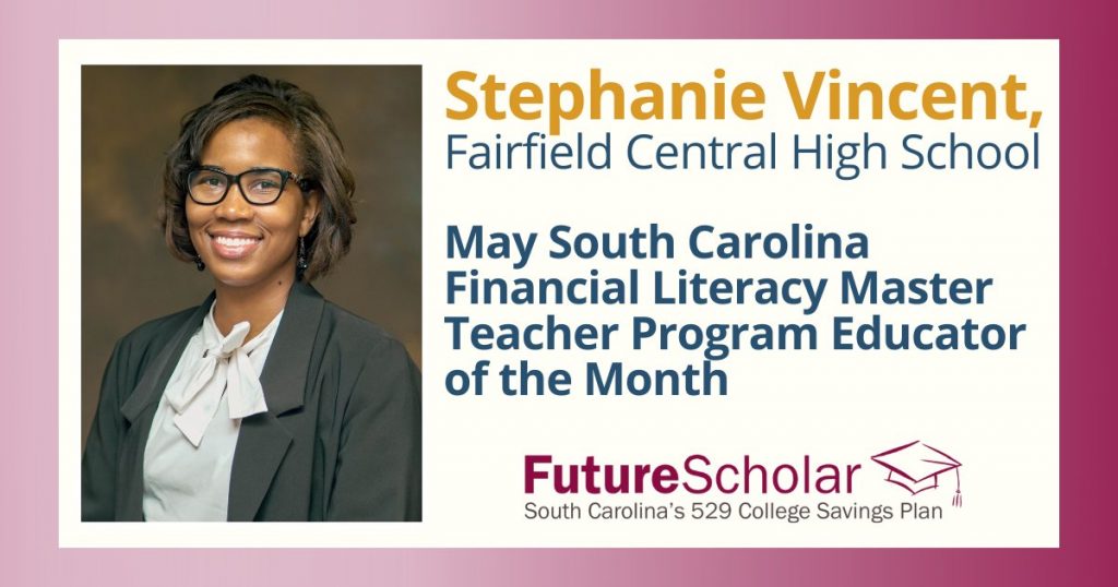 COLUMBIA – Stephanie Vincent of Fairfield Central High School has been recognized by South Carolina Treasurer Curtis Loftis as the South Carolina Financial Literacy Master Teacher Program’s Educator of the Month for May.