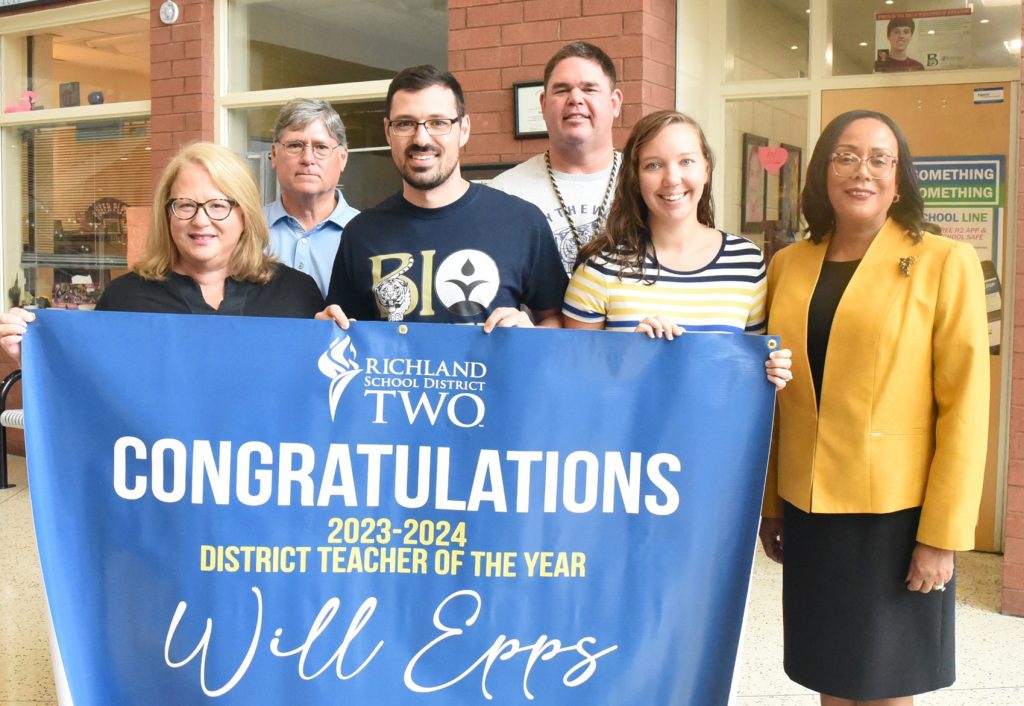 BLYTHEWOOD – The 2023-2024 District Teacher of the Year for Richland School District Two is Will Epps, a Science teacher at Blythewood High School. Superintendent Dr. Kim Moore and other district leaders made the surprise announcement on Sept. 13 at Blythewood High as members of the school band played the “Eye of the Tiger” by American rock group Survivor.