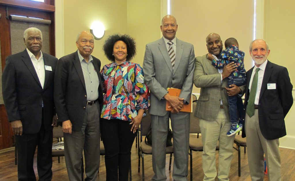 Presenters during the Blythewood Historical Society’s Black History Month program on Saturday were, from left: Roddy Egister (opening remarks), Jim Felder (civil rights activist speaker), Councilwoman Andrea Fripp (appeared on stage); Alex English (sports legend speaker), Blythewood Mayor Sloan Griffin holding his son (welcome comments), and Malcolm Gordge, president of the Blythewood Historical Society and Museum. Not shown: Margaret Kelly, (recognition of former Town Councilman Larry Griffin).