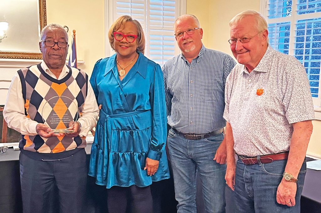 Mayor Pro-Tem Donald Prioleau accepts a plaque for his 24 years of service to Ridgeway from fellow councilmembers Belva Bush Belton, Dan Martin and Rick Johnson.