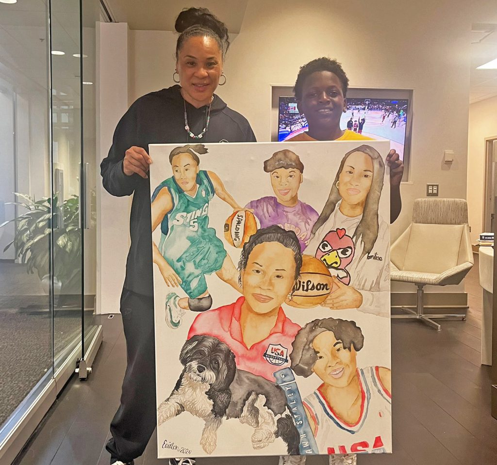 BLYTHEWOOD- Following the University of South Carolina’s National Title win on Sunday, Muller Road Middle School shared a photo on Twitter of sixth-grade student Eaiston Thompson’s painting of the legendary Gamecock head coach Dawn Staley. The painting depicts Staley in various stages of her basketball career.
