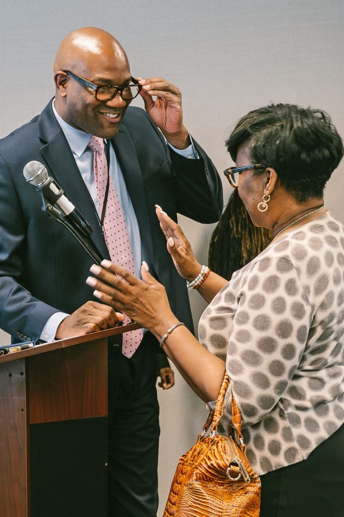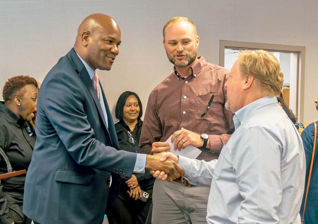 Following his remarks, Dr. Hemingway visited with attendees. At right, Town Manager Jason Taylor and Assistant Town Manager Chris Clausen welcome Dr. Hemingway.