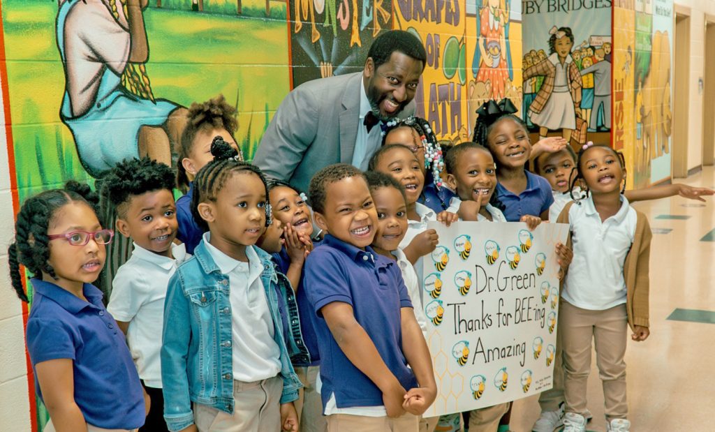 He arrived at Fairfield’s Kelly Miller Elementary School to a drum-show by the KMES drumline. Then, inside, Dr. Green was greeted by the 3-5 year olds… each proudly showing off their banners – this one thanking him for ‘BEE-ing so amazing’ during the 12 years he led Fairfield County School District.