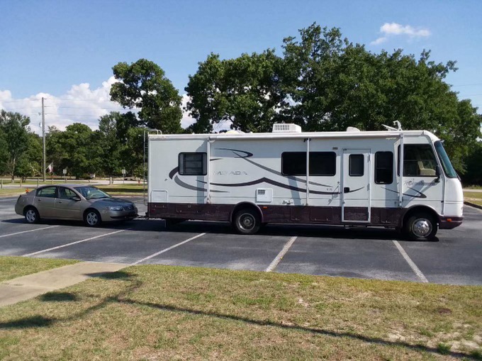 2001 Coachman Mirada 31’ Motor Home with pull behind 2007 Saturn car.