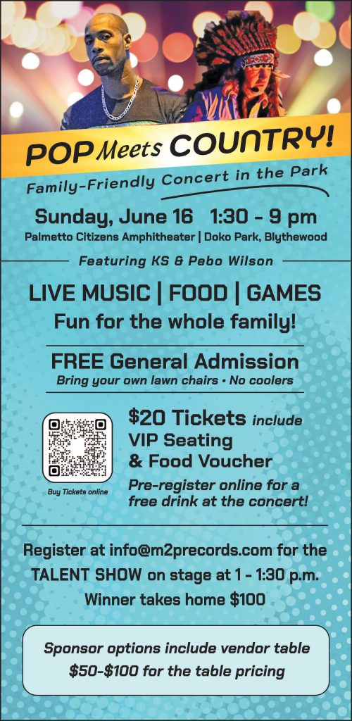 Vendor tables are $75, and sponsorship details are available online at https://www.m2precords.com/event-details/pop-meets-country-in-blythewood-sc