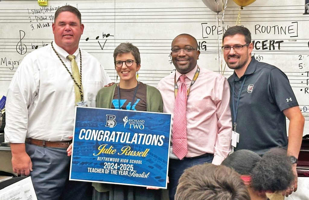 Richland Two surprised Blythewood High School teacher Julie Russell early last week.