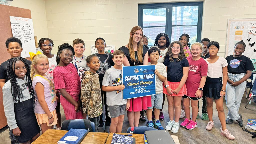 Round Top Elementary third grade teacher Hannah Cummings, center with sign, is one of five finalists for Richland District Two’s Teacher of the Year for 2024-2025. Cummings was surprised by the announcent during class by Richland Two Superintendent Dr. Kim Moore earlier this week. | Photos: Richland Two