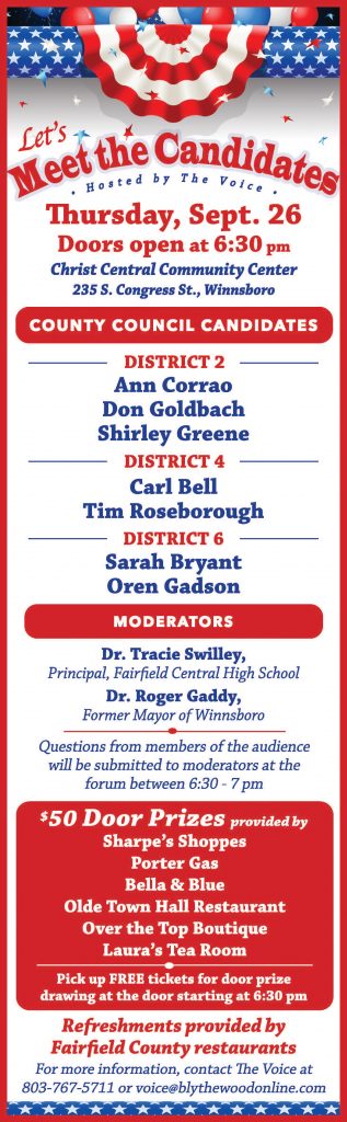 WINNSBORO – A candidate forum featuring the candidates running for seats on Fairfield County Council will be held on Thursday, Sept. 26, at Christ Central Community Center, in downtown Winnsboro.