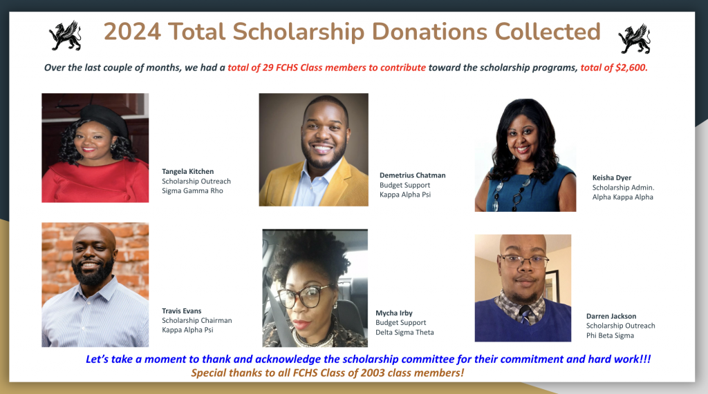 “Special thanks to FCHS Class of 2003 class members and the selected committee members for your donations, the hard work in continuing the scholarship, and the commitment to supporting the community and high school seniors,” he said.