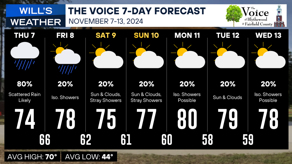 Moisture may linger over the region through the long term with at least a slight chance of rain each day. By this weekend, a weak cold front will drop into the state, allowing for drier and slightly cooler weather. But we flip the script once again on Monday as a warm front lifts through, and that could allow for a few more isolated showers, but slightly warmer temps across the Blythewood/Fairfield County area.