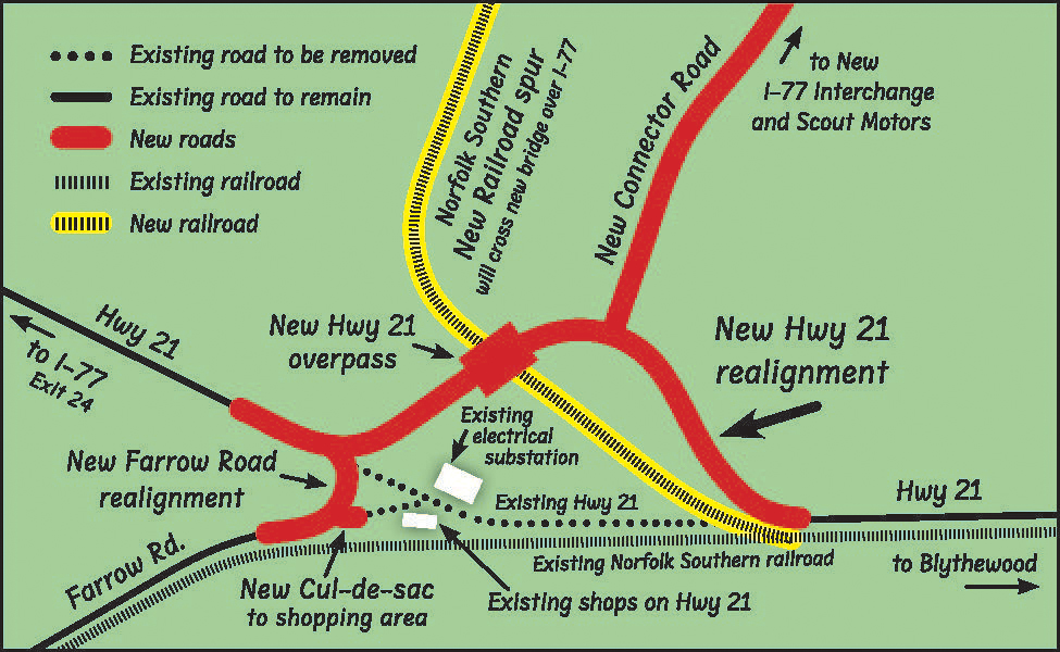 A new road will connect the realigned section of Hwy 21 to the Scout plant via a new I-77 interchange that will be located just north of the rail bridge over I-77.