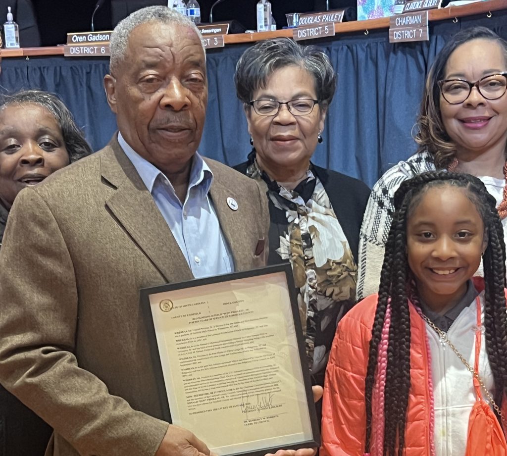 Council also recognized retired Ridgeway Town Councilman Don Prioleau, below, for his contributions to the Fairfield community during his lifetime. He served 24 years on the Ridgeway council, was one of the four founding members of Pig on the Ridge, shepherded the renovation of Fairfield School, brought a health clinic and a funeral home to Ridgeway, served on the executive committee of the Fairfield NAACP and as an elder in Lebanon Presbyterian Church for over 40 years, and much more.