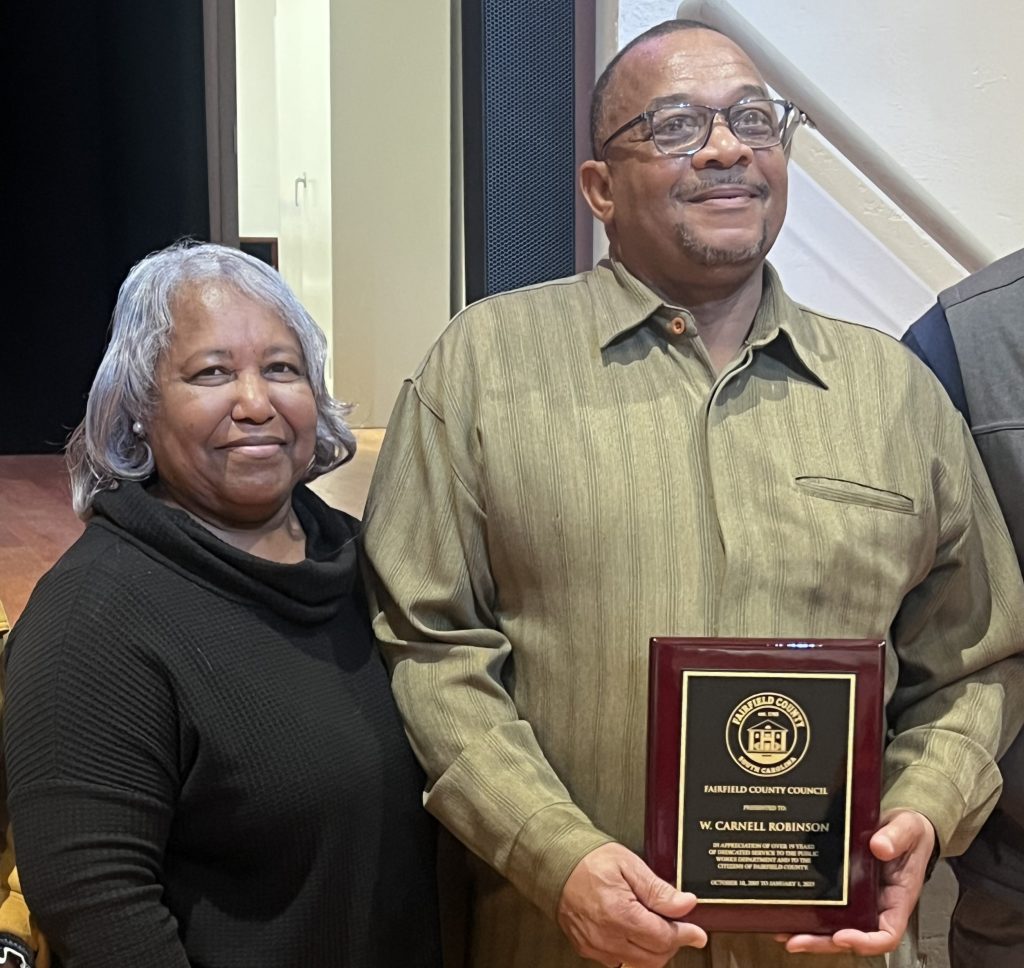 WINNSBORO – Fairfield County Council recognized the retirement of Carnell Robinson, above, with a proclamation. Shown here with his wife, Robinson served the citizens of Fairfield County in the Public Works Department for 19+ years.