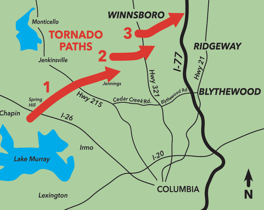 The first of the three tornadoes hit around 8:52 a.m. with peak winds of 80 mph, touching down near Highway 269 and Mockingbird Lane south of Rion in Fairfield County. It traveled 3.72 miles with a maximum width of 200 yards.