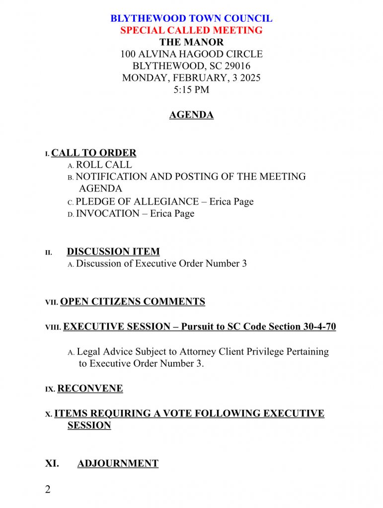- New Position Creation: This order also establishes Three Part-Time Public Works Positions under the Clean Sweep Blythewood Initiative to enhance public space maintenance and cleanliness.