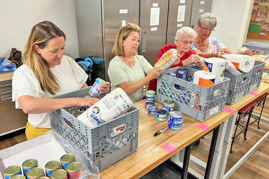 Kate Williams, left, executive director of Blythewood’s CAB facility, helps fill crates with food for clients. Shown with her are, left to right: Delores Langley (fundraiser for CAB), Jean Bowers, 95, (checks dates on food donations), and Loretta Reader (manages the pantry). | Barbara Ball