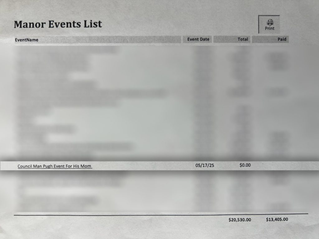 In a phone interview The Voice conducted with Pugh on Tuesday morning, July 15, he acknowledged the event held at the Manor, saying it was for his mother-in-law, not his mom, but said he was not comped for it. He told The Voice that it should have been charged. When asked if he paid for the event, he said his wife took care of the payment, but offered no other details. The charge for renting the Manor on a Sunday (May 17) is listed in the rate schedule as $3,700 – with a discount if the reservation is made within 60 days of the event.