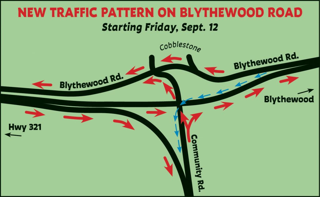BLYTHEWOOD – The traffic pattern on Blythewood Road will change starting the morning of Friday, Sept. 12.