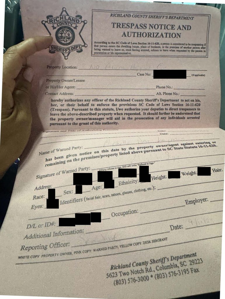 “(Redacted) having a medical episode, prompted a call for service by CFD [Columbia Fire Department] and RCEMS [Richland County EMS] with CFD arrived on scene first to stabilize (redacted). While CFD was working on (redacted) the enclosed envelope was collected, after (redacted) accept to take back the envelope. Deputies were informed by the officials of Blythewood they wanted to put (redacted) on Trespass from the property,” the report stated.