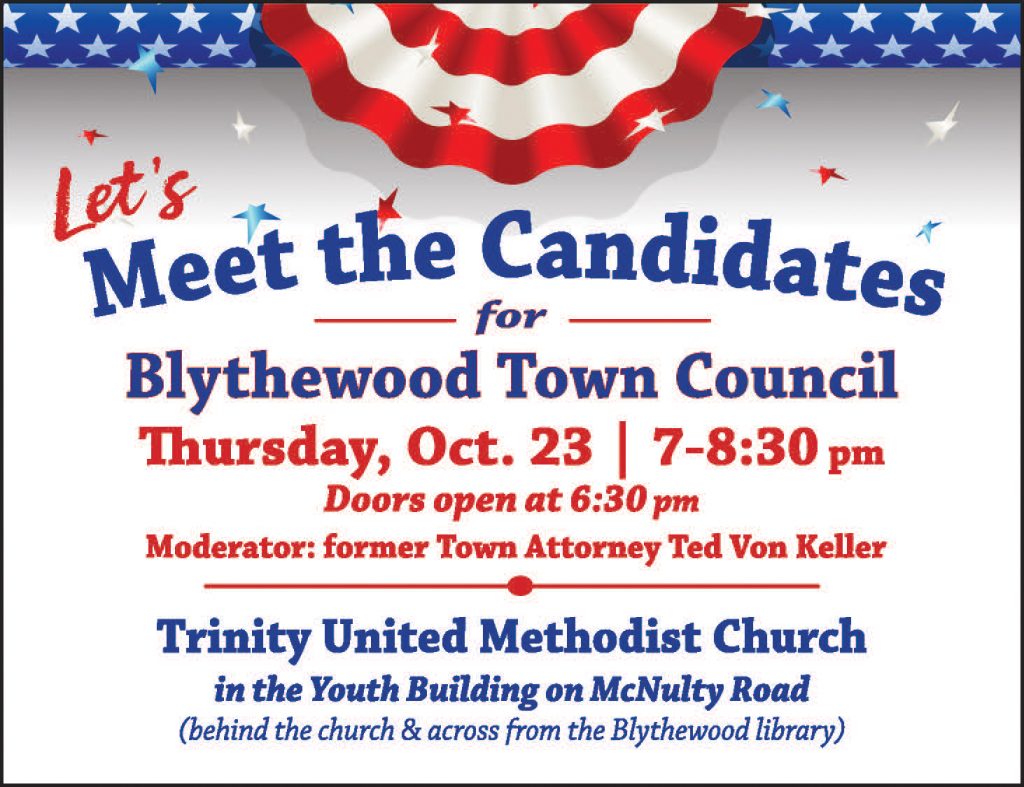 BLYTHEWOOD – A candidate forum featuring candidates running for two seats on Blythewood Town Council, will be held on Thursday, Oct. 25, at Trinity United Methodist Church’s Youth Building which is located behind the church facing McNulty Road.