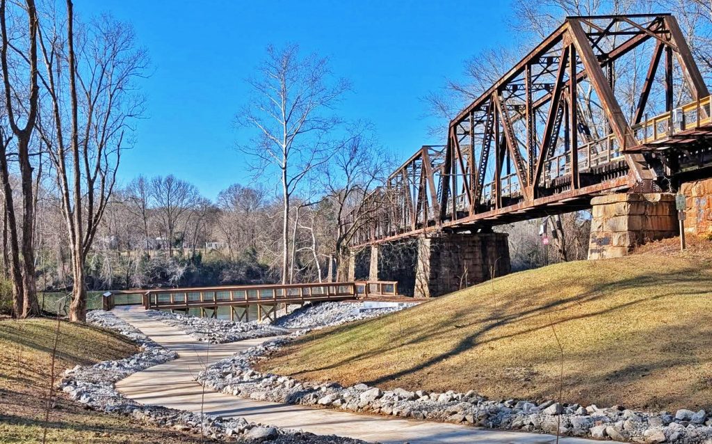 The rail-trail is known for its “easy” difficulty rating, featuring a level grade and a surface of crushed stone, dirt, and sand. It skirts the town of Peak before cutting a swath through the piedmont forest toward Pomaria and Prosperity in neighboring Newberry County.