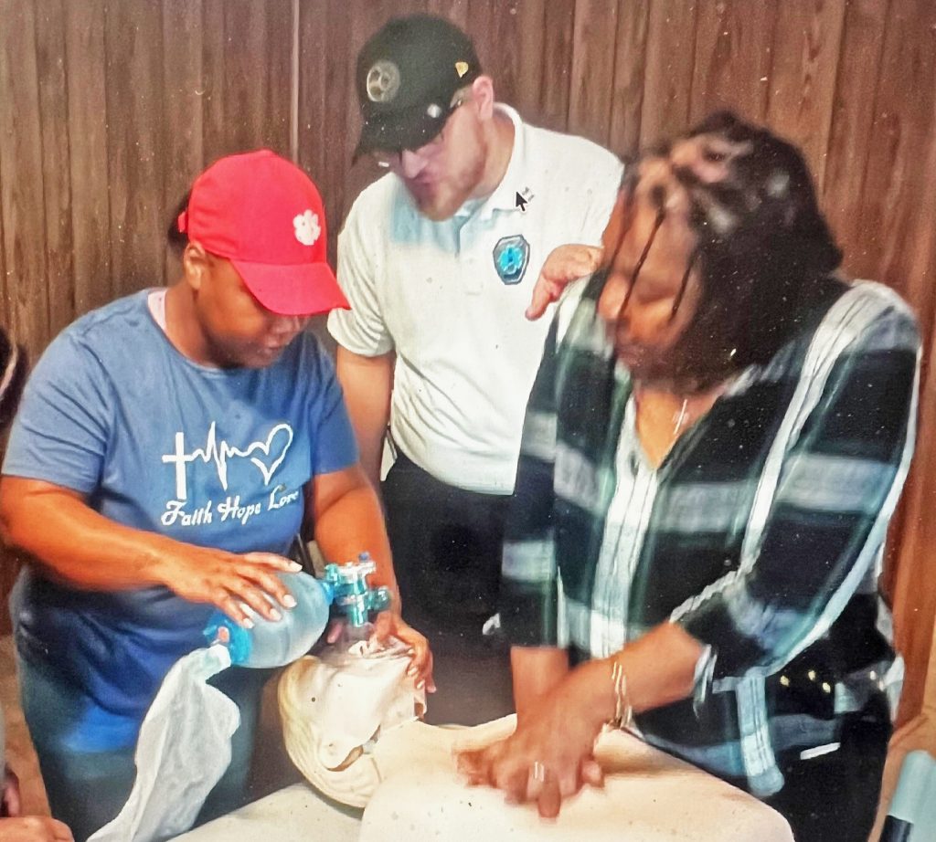 The three-hour workshop ran from 9 a.m. to noon. EMS staff brought mannequins and equipment and taught CPR for adults and infants, how to recognize cardiac arrest, and what to do in respiratory emergencies. Participants worked in small groups, rotating through stations with the mannequins.