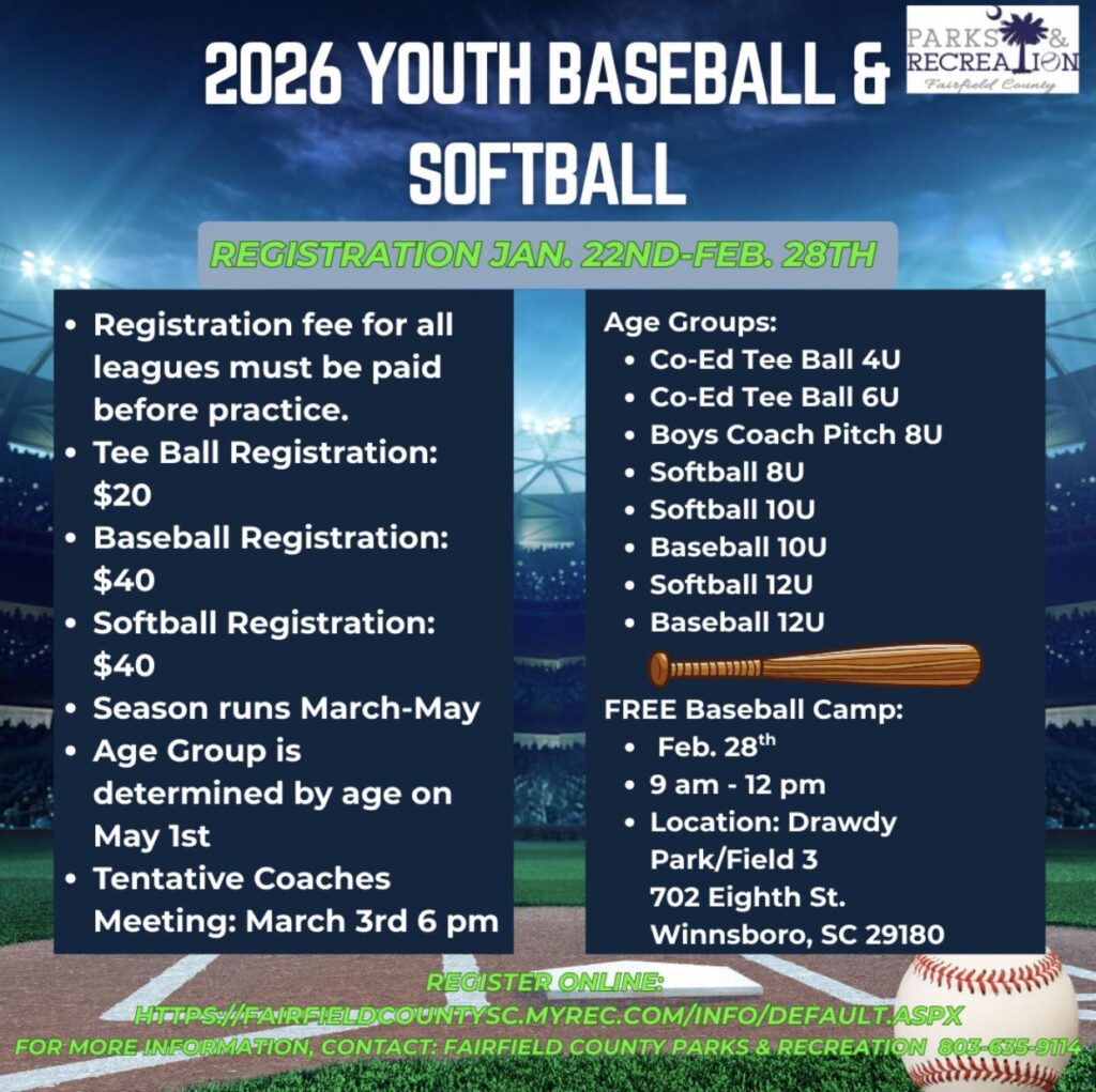 Before kicking off the new season, the county will host a free baseball camp on Saturday, Feb. 28 from 9 a.m. to 12 p.m. at Drawdy Park (702 Eighth St., Winnsboro).