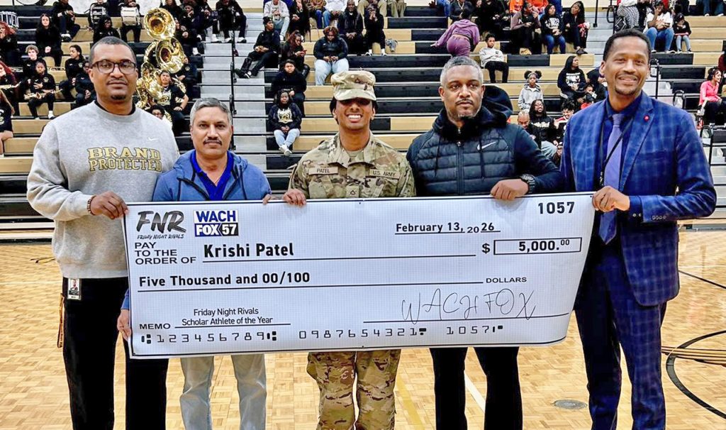 WINNSBORO – Fairfield Central senior Krishi Patel, center, was recognized at the Griffins’ basketball game last week for being named WACH Fox’s Scholar Athlete of the Year. A multi-sport athlete at Fairfield Central, Patel is a member of the Griffins’ football and soccer teams. The award is a part of WACH Fox’s Friday Night Rivals segment.
