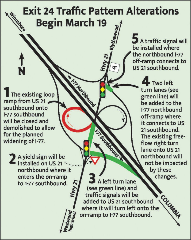 BLYTHEWOOD – Several traffic pattern changes are coming to Exit 24 in Blythewood, and construction work is expected to begin March 19, according to SCDOT officials.