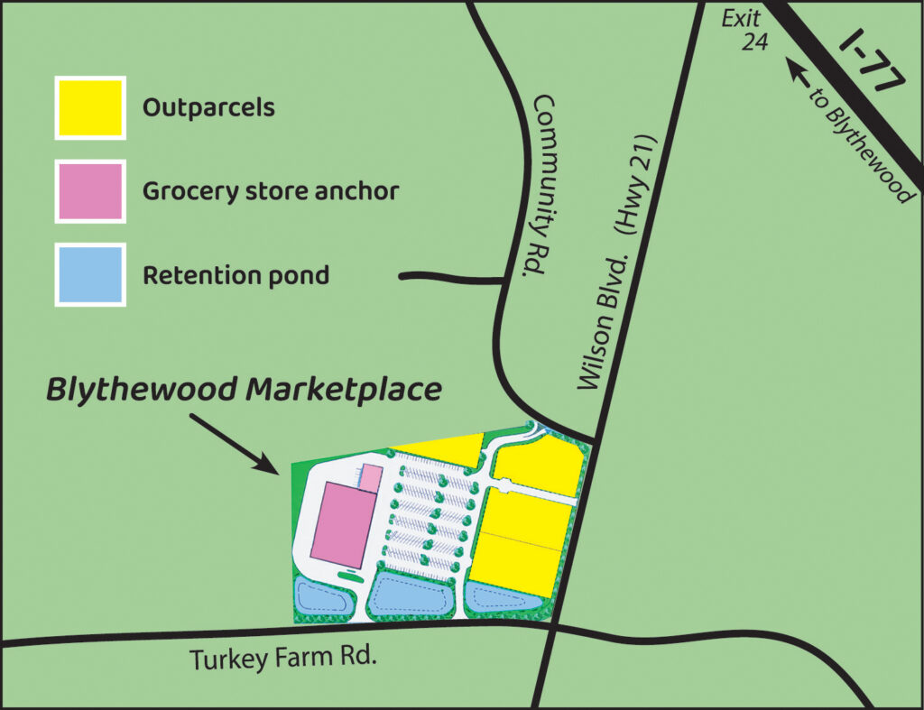 The 14-acre property will be called Blythewood Market Place and is located on Highway 21, between Turkey Farm Road and Community Road. Several outparcels suited for retail, service, and restaurant businesses are also located on the property.